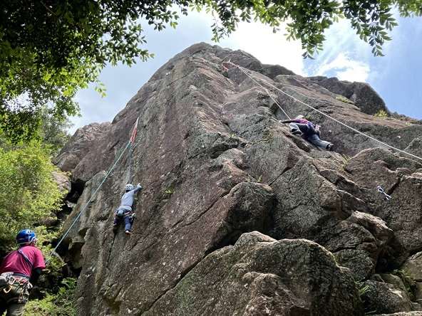 「ビレイからの脱出」実技訓練を行いました。万が一のときのためにも必要な訓練です。